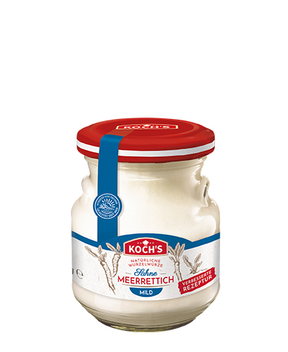KOCH’S Sahne Meerrettich schmeckt angenehm mild und bleibt dennoch intensiv im Meerrettichgeschmack. Frisch geriebener Meerrettich wird nach einem traditionellen Rezept mit Sahne verfeinert und mildert so die Meerrettichschärfe.